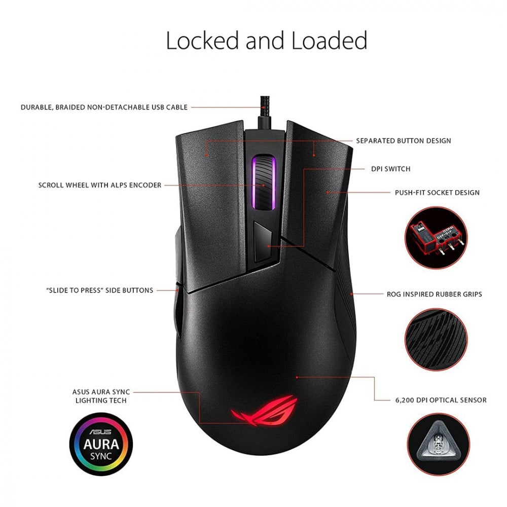 - ROG-exclusive push-fit switch-socket design to vary click resistance and extend the lifespan of the mouse